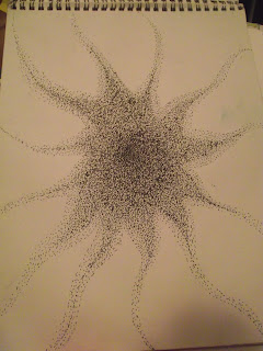 In honor of the cool pointillism painting my dad found while we were thrift shopping this week and the pointillism picture I did of the ammonite, today's picture is one from high school. It is a pointillism doodle I did in high school, sadly it has one line in it that was an accident but sad all the same. I also have no more interesting things to type up this time. I'm currently watching Lord of the Rings: Fellowship of the Ring with my husband, and I'm ready to be done typing and cuddle with him to watch the movie. Nights with him are quite rare around these parts because he works nights, and I kinda like him and want to cuddle him.